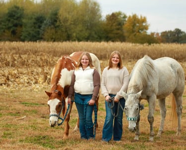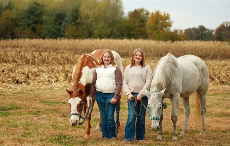 Pictured above: Amos, 26 year old APHA pleasure gelding and our daughter, Kinsley. Koah, 17 year old Thoroughbred mare and our daughter, Shelby.
